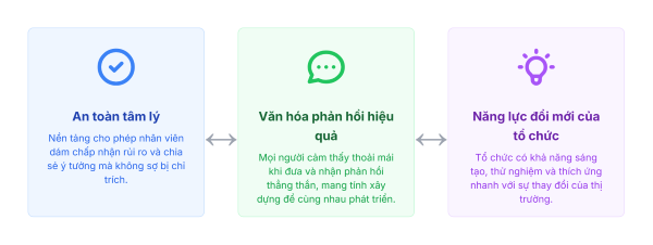 Văn hóa phản hồi hiệu quả và năng lực đổi mới tổ chức tạo thành một vòng tuần hoàn tăng cường lẫn nhau, trong đó mỗi yếu tố không chỉ thúc đẩy mà còn được nuôi dưỡng bởi yếu tố kia. Nghiên cứu từ PwC cho thấy các tổ chức tích cực thu thập và triển khai phản hồi nhân viên có khả năng đổi mới thành công cao hơn 57%, đồng thời đạt được mức tăng 30% kết quả đổi mới khi áp dụng hệ thống phản hồi liên tục. Cơ chế này hoạt động theo nguyên lý: văn hóa phản hồi tạo ra môi trường an toàn tâm lý để nhân viên chia sẻ ý tưởng sáng tạo, các ý tưởng này được lắng nghe và cải tiến thông qua phản hồi xây dựng, dẫn đến những đổi mới thành công, và thành công này lại củng cố niềm tin của nhân viên trong việc tiếp tục đóng góp ý kiến.